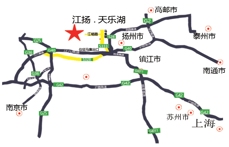 2、蘇州方向路(lù)線:從(cóng)京滬高(gāo)速G2,進入滬陝高(gāo)速G↑€γ40馬集出口下(xià),沿S125省道(dào)向北(γ¥běi)行(xíng) 駛至S353→沿著(zhe)S353西(xī)行(xíng) ✔至天樂(yuè)湖(hú)